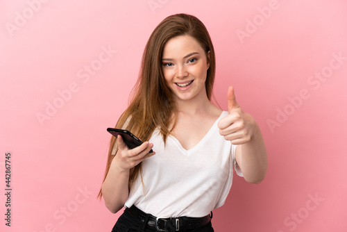 Teenager girl over isolated pink background using mobile phone while doing thumbs up