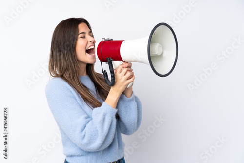 girl, woman, woman, people, person, female, studio, teenage, teenage, youth, young, caucasian, brazilian, isolated, background, wall, white, blank, megaphone, speak, communicate, loudspeaker, announcement, scream, expression, concept, shout, shouting, loud, message, voice, talk, communication, bullhorn, speaking, announce