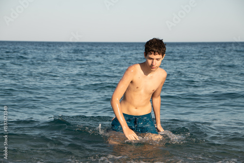 Teenager having fun swimming in the sea at the beach during summer vacation. A young boy enjoying the water on a sunny holiday. Concept of youth, freedom, happy active lifestyle outdoors by the ocean