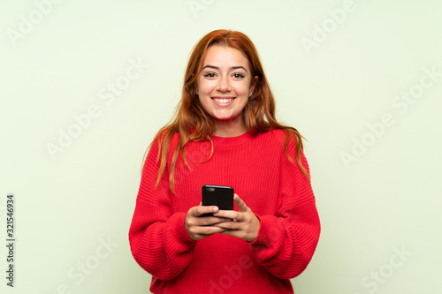 Teenager redhead girl with sweater over isolated green background using mobile phone
