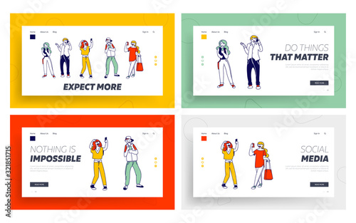 Teenagers Gadget Addiction Website Landing Page Set. Teens Communicate by Cellphones, Texting Sms and Making Selfie on Smartphone, Mobile Usability Web Page Banner. Cartoon Flat Vector Illustration