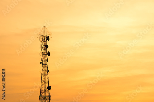 Telecommunication antennas sunset background