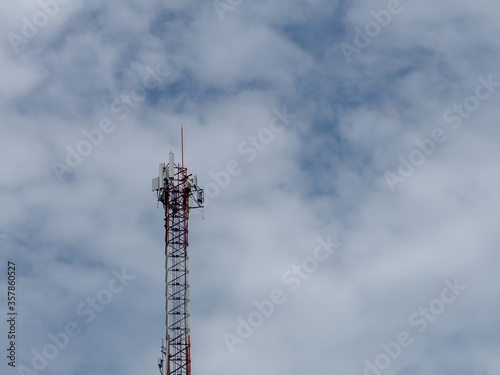 Telecommunication tower of 4G and 5G cellular. Cell Site Base Station. Wireless Communication Antenna Transmitter. Telecommunication tower with antennas against blue sky background.