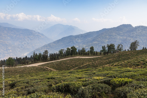 Temi Tea Garden with mountain and enormous cloud in the background in winter near Gangtok. Sikkim, India.