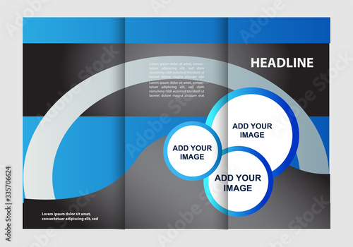 Template design of blue trifold brochure. Editable and light vector with places for photos. Proportionally A4