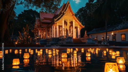 temple, courtyard, illuminated, floating, lantern, serene, tranquil, peaceful, asian, architecture, ornate, night, light, water, traditional, culture, decor, atmospheric, glow, beauty, magical, mysterious, spiritual, aethereal, exotic