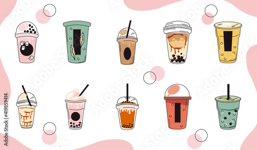 bubble, soft, pink, sweet, pot, ten, green, container, straw, hot drink, cold, drink, chocolate, accessory, beverage, ice cube, ice, drink, cube, taiwanese, popular, summer, pearl, ball, delicious, plastic, tapioca, leaf, liquid, set, vector, illustration, design