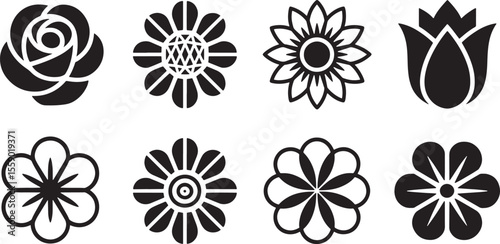 flower, icon, set, black, white, floral, design, geometric, simple, botanical, element, graphic, vector, illustration, rose, daisy, sunflower, tulip, shape, pattern, monochrome, minimalist, symbol, emblem, logotype, template, art, style, abstract, decoration, ornament