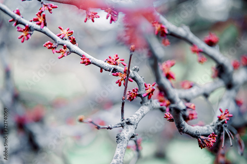 tender blooming in spring, young leaves, warming on a sunny day. beautiful young apricot flower on a green branch in the garden, close-up..