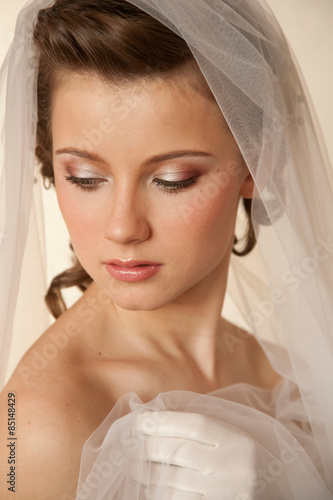 bride, closeup, engagement, female, one person, wedding, bridal gown, evening gown, wife, woman, make-up, young, girl, profile, adult, beautiful, human, caucasian, white, married, vertical, indoor, cute, elegance, femininity, 1950s, sensuality, daylight, glove, veil, portrait, coiffure