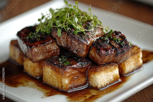 tender, glazed meat served on crunchy toasted bread squares, garnished with rich microgreens and an artistic drizzle of sauce