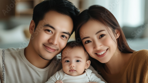 Tender moment between an Asian family, father mother and their baby at home smiling