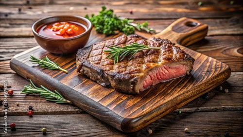 Tender steak slice on wooden board with a juicy center and a slightly charred edge, served with a sprinkle of fresh herbs and a side of warm sauce , steak slice, savory meal