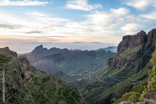 tenerife, rock, mountain, canary island, island, panoramic, evening, dark, night, sunset, dawn, cloud, peak, canyon, road, curved, twisted, mountain road, cliff, ocean, atlantic, horizon, silhouette, nobody, scenic, shore, volcanic, mountain, empty, canary, travel, journey, spain, nature, landscape, highland, spanish, scenery, tour tourism, vacation, ravine