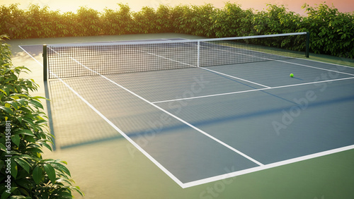 Tennis Court in Sunlight: The vibrant green court is bathed in the soft glow of the sun, ready for a match, framed by lush greenery. The net stands taut.