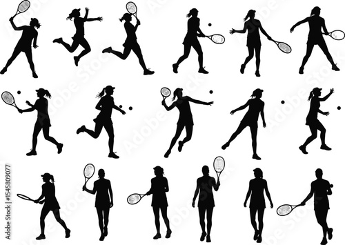 Tennis player silhouettes, black vector poses, action racket motion, athletic sports design, competitive match illustration, outdoor game icon, dynamic figure artwork, fitness concept