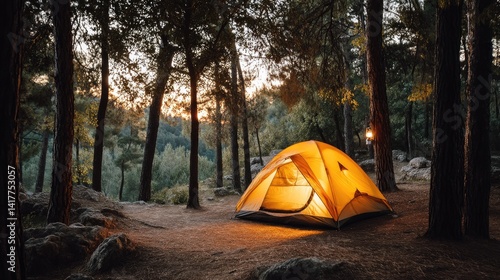 Tent glows in forest, camping at dusk, travel, adventure, outdoor life