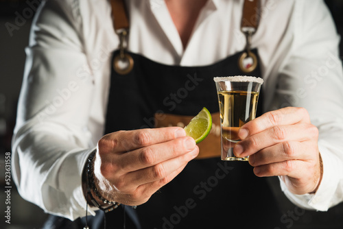 Tequila. A professional bartender in a white shirt and black apron holds a glass of tequila shot, the trend drinks concept.