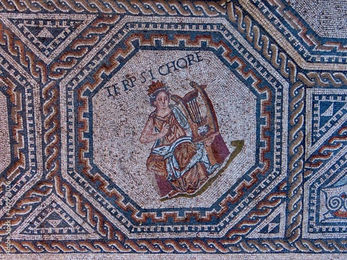 Terpsichore - one of 9 muses portrayed in medalion with geometric ornamented borders. The Roman floor mosaic is freely accessible for everybody outdoors in Vitchen, Luxembourg