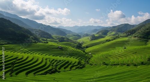 Terraced rice fields in green mountainous landscape. Scenic view of agricultural land in Southeast Asia. Rural farming, nature tourism, and sustainable agriculture concept