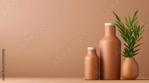 terracotta, bottle, vase, plant, leaf, brown, background, minimalist, simple, modern, design, interior, decor, home, office, studio, still life, product, presentation, branding, natural, earthy, organic, rustic, texture, blank, empty, copy space, neutral, muted, soft, elegant, clean, light, shadow, three-dimensional, rendering