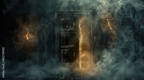 Terrifying door leading into the depths of hell, surrounded by dark smoke and mist, cobwebs clinging, and flames flickering menacingly