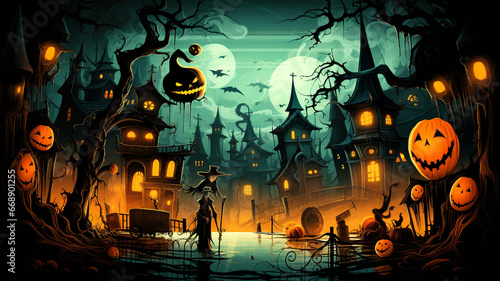 Terrifying street decorated for Halloween in comic book style. Generative AI
