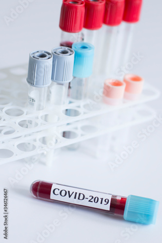 Test tubes with blood for coronavirus test.2019-nCov epidemic virus concept.