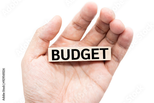 Text BUDGET wooden block on hand with Clipping path isolate on white background. Financial and business concept. Budget planning concept.