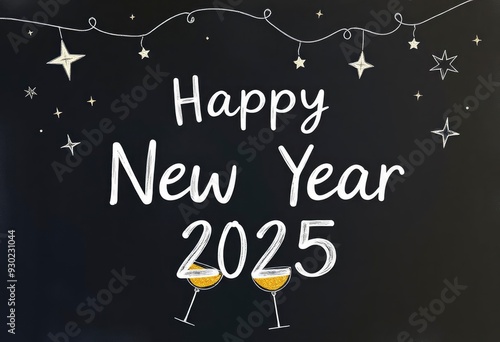 text 'Happy New Year 2025' in a chalkboard style with hand-drawn elements like stars and champagne glasses, giving a cozy feel, ai