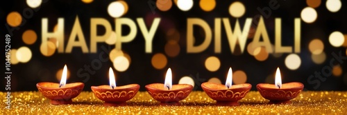 Text, inscription "Happy Diwali" with traditional Diya lamps and golden confetti celebrating the festival of lights in India and Fiji, panoramic banner