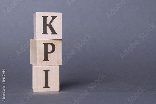 Text KPI on wood blocks on dark gray background. Key performance indicator, KPI concept.