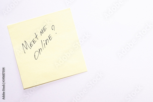 Text message, lettering. Meet me online. Lettering with marker on sticker. Copy space