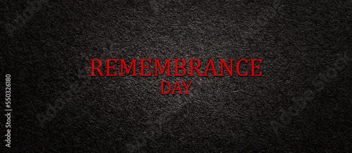 Text Remembrance Day on black textured background. Remembrance Day, Memorial Day, Anzac Day in New Zealand, Australia, Canada and Great Britain. Banner.