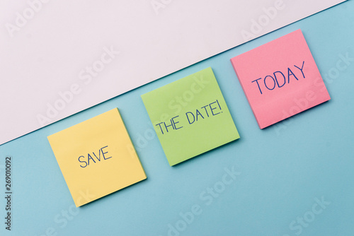 Text sign showing Save The Date. Business photo showcasing remember not schedule anything else on this day Pastel colour note papers placed sideways on the of softhued backdrop