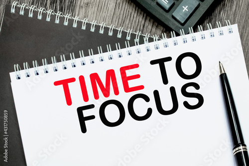 text TIME TO FOCUS to the background of a notebook, pen. The concept of business and education.