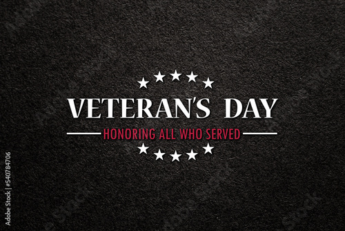 Text Veterans Day Honoring All Who Served on black textured background. American holiday typography poster. Banner, flyer, sticker, greeting card, postcard.