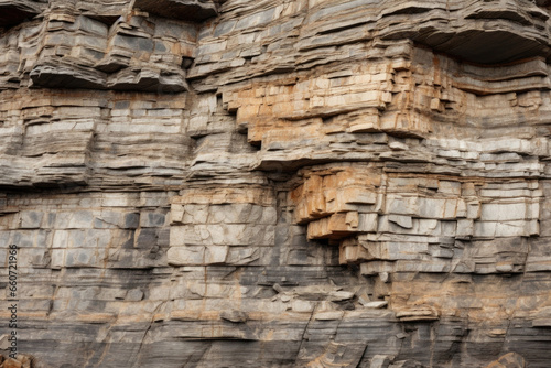 Texture of a craggy cliffside, with layers of sedimentary rocks jutting out in uneven formations. The surface is weathered and worn, with a mix of light and dark shades.