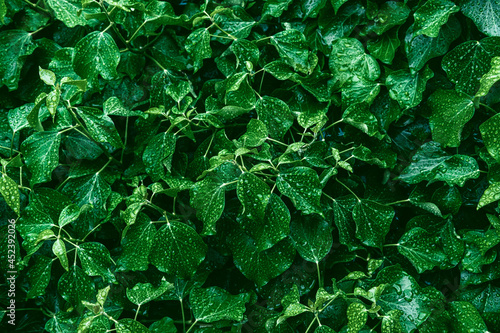 Texture of many fresh beautiful leaves with raindrops. Natural background.