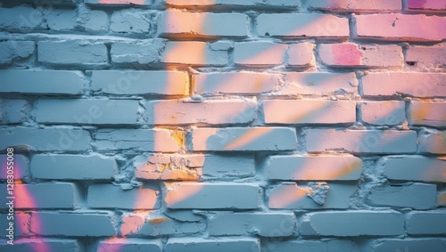 Textured blue brick wall with colorful light shadows creating patterns on the surface.
