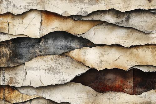 Textured grunge collage featuring layered elements of torn paper and faded paint in earthy tones