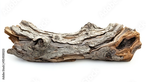 Textured tree bark piece isolated on white background showcasing natural wood patterns and colors for artistic and design uses.