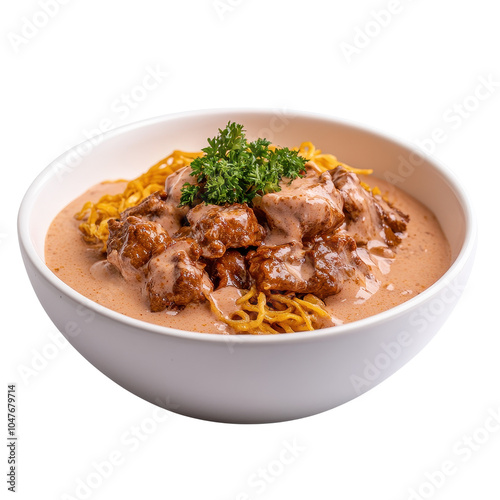 Thai food Khao Soi chicken dish with creamy sauce and noodles, garnished with fresh parsley in a white bowl. isolated on white background.