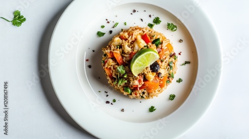Thai fried rice with crab meat and lime on a clean white plate