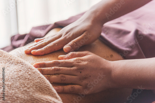 Thai massage Scrubs Spa body back legs pain massage. Asian woman back side therapy relax treatment in spa salon. Woman happy relax skin lying spa bed use organic oil Scrubbing wellness body skincare