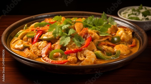 Thai mixed seafood curry with vegetables, space on the left, Soft Natural Light,generative ai illustration