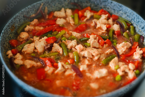 kitchen, dish, chicken, stew, red pepper, sauce, pan, food, asia, asian, chili, delicious, dinner, epicure, green, herb, homemade, lunch, meat, receipe, soup, spicey, thai cuisine, thai food, siam, traditional, vegetable, topview, healthy, diet