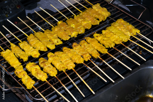 Thai pork satay, grilled pork onto wooden sticks on stove.