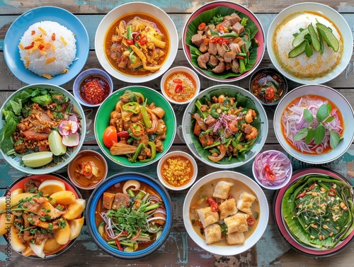 Thai street food assortment in colorful dishes, vibrant flavors, food flat lay, commercial use