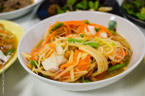 traditional, asian, papaya, delicious, thai, egg, siam, healthy, salad, food, fresh, health, green, chili, cookery, sauce, tomatoes, fruit, spicey, dish, vegetable, eatery, cooking, eat, red, tropical, shrimp, hot, diet, asia, wood, style, lunch, white, local, lemon, table, plate, menu, bean, dinner, sour, sweet, salted, bowl, rice, ravenous